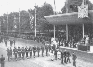 Το μεγαλειώδες θέαμα των στρατευμάτων που παρελαύνουν επί ώρες ενώπιον της Βρετανικής Βασιλικής Οικογένειας αποτέλεσε μία αρχική έκφραση ευγνωμοσύνης προς τους πολεμιστές που έγραψαν το έπος του πενταετούς πολέμου. Ο Βασιλεύς Γεώργιος των Ελλήνων παρακολούθησε την τελετή μαζί με τον Στρατηγό Αλέξανδρο Παπάγο και τον Ναύαρχο Καββαδία. Του ελληνικού στρατιωτικού αγήματος προπορεύεται ο Υποπτέραρχος Τήλιος, ακολουθούμενος από τον Σμήναρχο Αντωνάκη, τον Αντιπλοίαρχο Τσουκαλά και τον Πλοίαρχο Σκλαβενίτη. Ο Υποπλοίαρχος Στεφανάκης περήφανα φέρει την Ελληνική Σημαία της Ταξιαρχίας του Ρίμινι ανάμεσα σε δύο Ευζώνους.