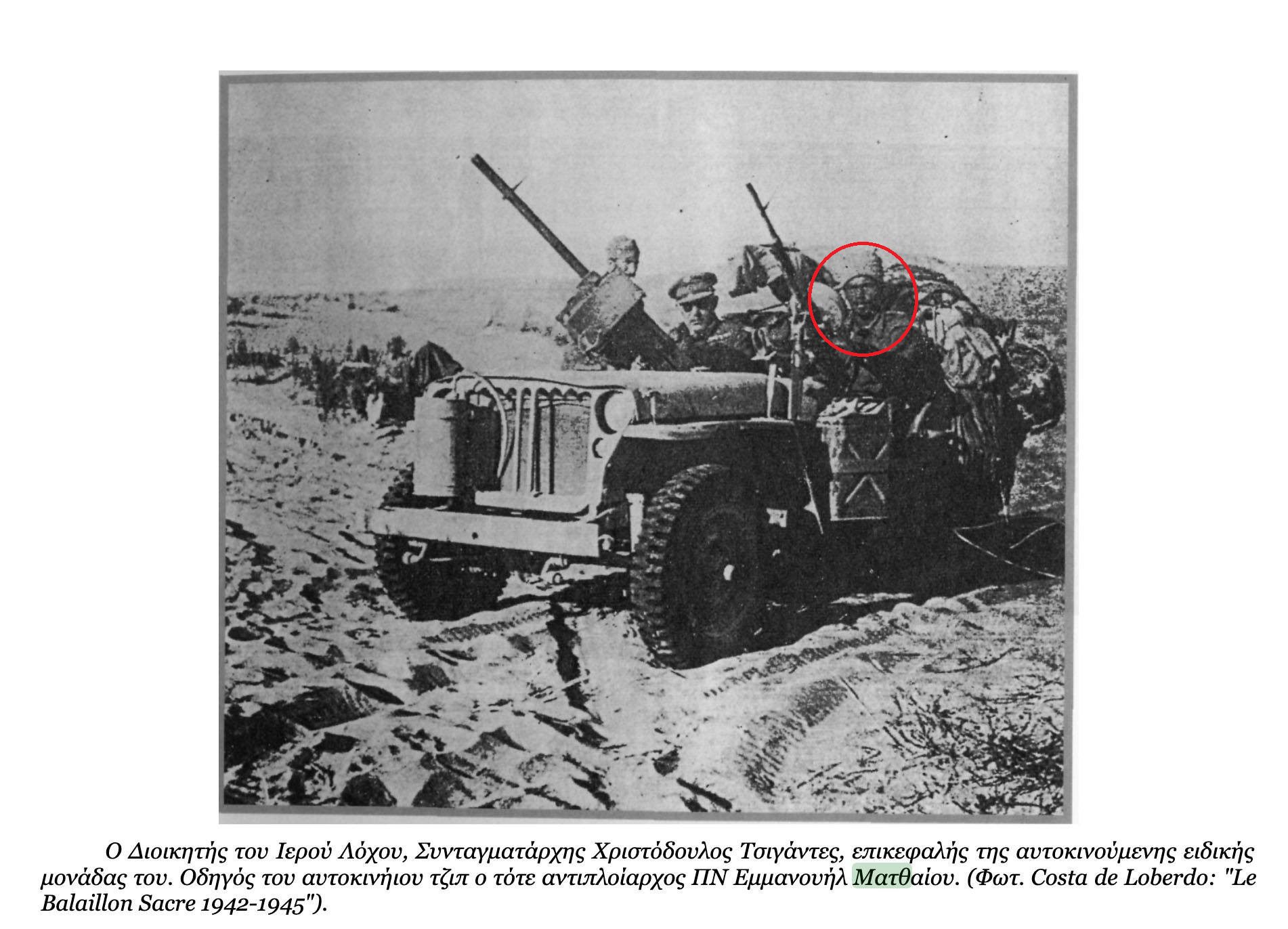 Τον Οκτώβριο 1942 όταν δημιουργείται ο Ιερός Λόχος ο Ματθαίος ζητά από τους πρώτους να καταταγεί εθελοντής! Του αρνούνται, γιατί τον θεωρούν απαραίτητο για το Ναυτικό, εκείνος όμως επιμένει γιατί δεν του αρκεί ο «παθητικός πόλεμος», θέλει να πολεμήσει ενεργά τον εχθρό! Μαζί με τον Διοικητή του Ιερού Λόχου Χριστόδουλο Τσιγάντε κατορθώνουν να πείσουν Ναυάρχους, Υπουργό και Εγγλέζους και ο Ματθαίος τελικώς εντάσσεται στον Ιερό Λόχο, όπου υπηρετεί ως «δεκανέας». Είναι ο πρώτος και ο μεγαλύτερος σε βαθμό αξιωματικός του Βασιλικού Ναυτικού που γίνεται Ιερολοχίτης. Συμμετέχει στη Διοίκηση του Λόχου και ως ναυτικός είναι πολύτιμος στη «ναυσιπλοΐα» της ερήμου, ιδιαίτερα τη νύκτα. Πολλές φορές μαζί με τον Τσιγάντε παίρνουν το τζιπ τους με ένα πολυβόλο και δύο αυτόματα όπλα και με οδηγό τον Ματθαίο εισχωρούν βαθιά στην έρημο, πίσω από τις εχθρικές γραμμές και επιστρέφουν το πρωί. Έχει μαζί του όλα τα ναυτικά όργανα: θεοδόλιχους, εξάντες, αστρονομικούς πίνακες. Είναι τέτοια η ακρίβεια των στιγμάτων που επιτυγχάνει χάρις στον Ματθαίο ο Ιερός Λόχος που από το στρατηγείο του Μοντγκόμερι θα ζητήσουν στίγματα για αεροδρόμια, σταυροδρόμια, πηγάδια στην Έρημο (βλ. άρθρο αρ.25 Χρ.Τσιγάντε στην εφ.Εθνος ).