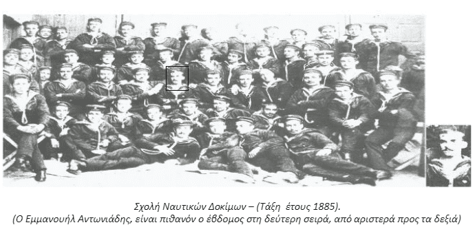 Ο Εμμανουήλ Αντωνιάδης σκοτώθηκε στις 11 Απριλίου 1897, στη Σκάλα Λεπτοκαρυάς και ήταν ο πρώτος νεκρός απόφοιτος της Σχολής Ναυτικών Δοκίμων. Γεννήθηκε στην Αθήνα στις 23-08-1869. Πατέρας του ήταν ο Κρητικός Γεώργιος Αντωνιάδης, ενώ μητέρα του η Υδραία αρχοντοπούλα Κονδύλω Θεοδωράκη. Εισήχθη στη Σχολή Ναυτικών Δοκίμων, στις 12-07-1885, (λειτουργούσε από το 1884), από την οποία αποφοίτησε στις 05-08-1889, ως μάχιμος σημαιοφόρος. Πέντε χρόνια αργότερα προήχθη σε ανθυποπλοίαρχο, όποτε, συμπληρώνοντας και τις ναυτικές του γνώσεις στην Ευρώπη, διέθετε πλέον όλες τις προϋποθέσεις, ώστε να εξελιχθεί σε έναν λαμπρό αξιωματικό του Ναυτικού. Υπηρέτησε σε πλοία επιφανείας, μετεκπαιδεύτηκε στις τορπίλες το 1895-1896 στο εξωτερικό.