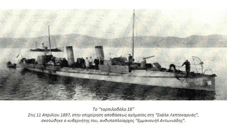 Πρέπει να τονίσουμε, πως από την καταδρομική ενέργεια, η οποία έγινε τον Απρίλιο του 1897, στη “Σκάλα Λεπτοκαρυάς” και όπου σκοτώθηκε ο ανθυποπλοίαρχος Εμμ. Αντωνιάδης, μας έχει διασωθεί μία τουρκική σημαία, που πάρθηκε ως λάφυρο και βρίσκεται στο Ναυτικό μουσείο της Ελλάδας, – τη σημαία αυτή τη βλέπουμε παρακάτω (συλλογή μουσείου με αρ. 1965, & άδεια χρήσης αρ. ΙΔΙΩΤ./01/30/2019, Πειραιάς 15 Μαρτίου 2019 – του Ναυτικού Μουσείου Ελλάδος – προς τον κ. Τζιόλα Ιωάννη).