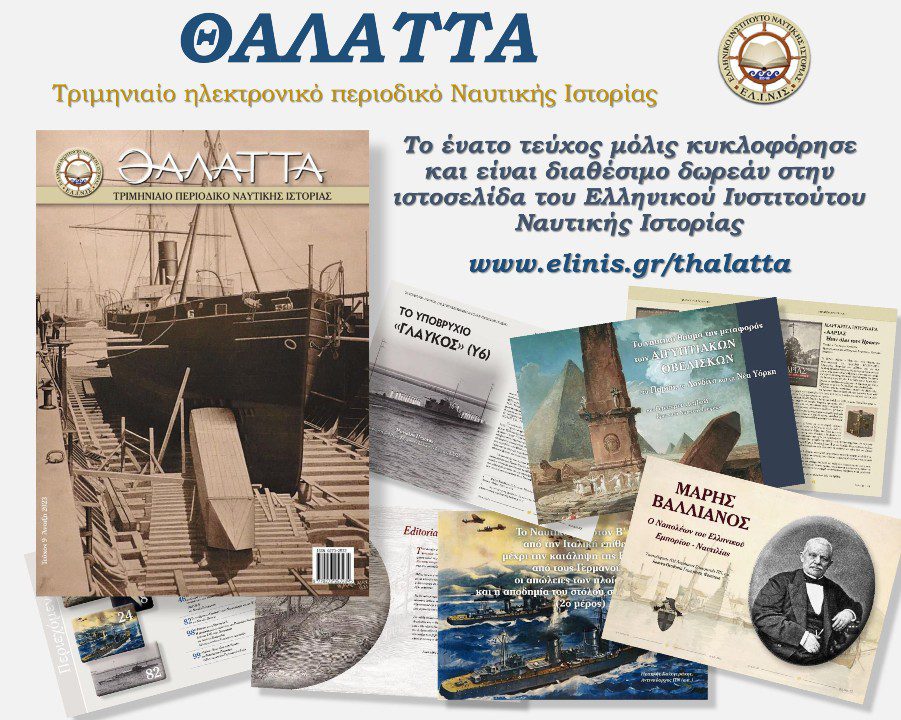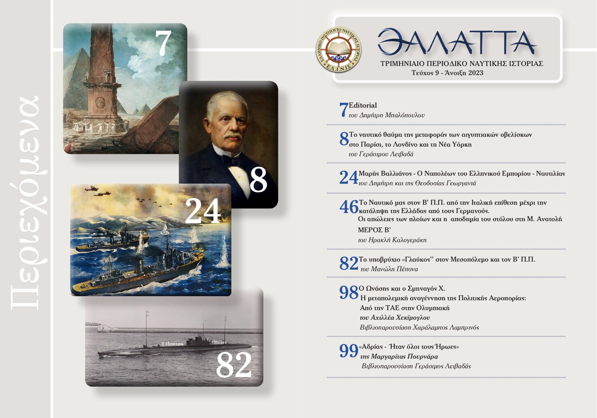 Το νέο τεύχος του Τριμηνιαίου Περιοδικού Ναυτικής Ιστορίας “ΘΑΛΑΤΤΑ”, με λίγη καθυστέρηση είναι κοντά σας . Κλείνοντας δύο χρόνια από την κυκλοφορία του πρώτου τεύχους μας, σας παρουσιάζουμε το 9ο τεύχος (Άνοιξη 2023) που περιλαμβάνει: