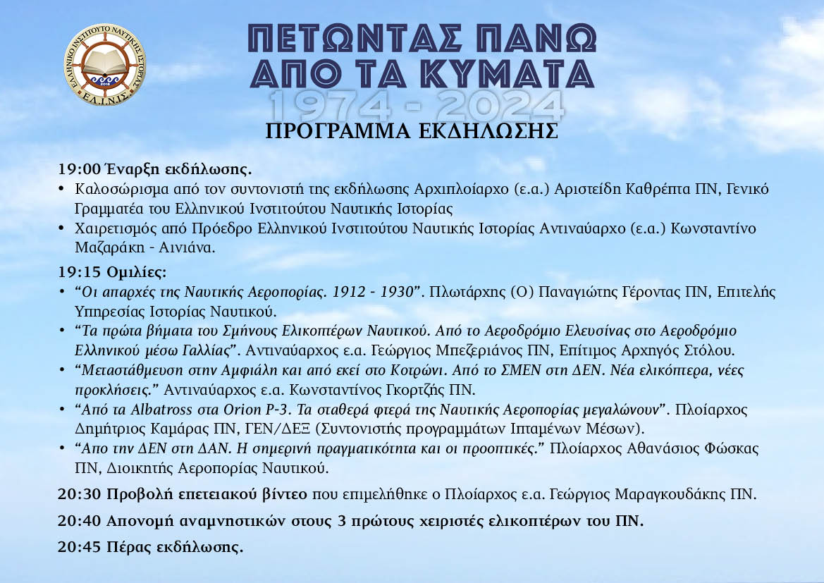 Τo Ελληνικό Ινστιτούτο Ναυτικής Ιστορίας με αφορμή τη συμπλήρωση 50 ετών από την επανασυγκρότηση της Ελληνικής Ναυτικής Αεροπορίας διοργανώνει ανοικτή για το κοινό εκδήλωση προκειμένου να τιμηθεί η ιστορία και η σημαντική μέχρι σήμερα προσφορά του αεροπορικού βραχίωνα του Πολεμικού Ναυτικού. Η εκδήλωση θα λάβει χώρα στο Αμφιθέατρο του Πολεμικού Μουσείου Αθηνών την Τετάρτη 22 Μαΐου 2024 στις 19:00.