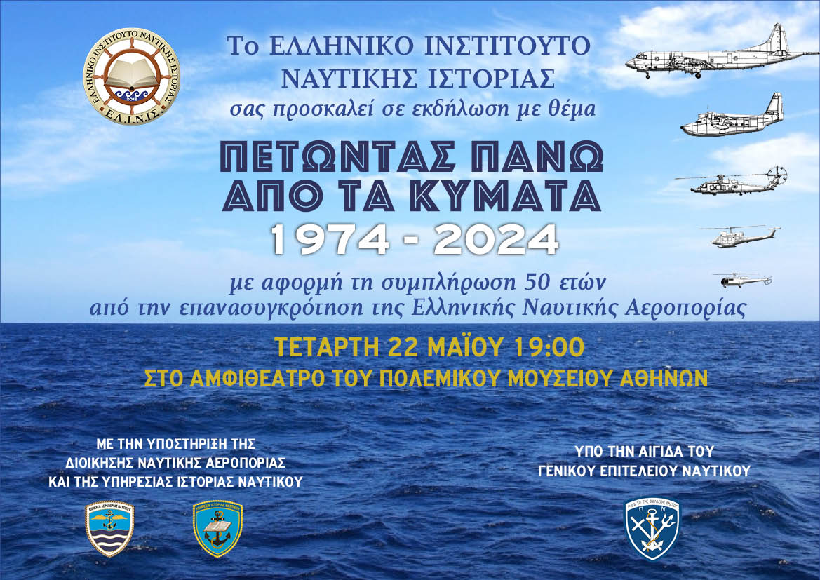 Τo Ελληνικό Ινστιτούτο Ναυτικής Ιστορίας με αφορμή τη συμπλήρωση 50 ετών από την επανασυγκρότηση της Ελληνικής Ναυτικής Αεροπορίας διοργανώνει ανοικτή για το κοινό εκδήλωση προκειμένου να τιμηθεί η ιστορία και η σημαντική μέχρι σήμερα προσφορά του αεροπορικού βραχίωνα του Πολεμικού Ναυτικού. Η εκδήλωση θα λάβει χώρα στο Αμφιθέατρο του Πολεμικού Μουσείου Αθηνών την Τετάρτη 22 Μαΐου 2024 στις 19:00.