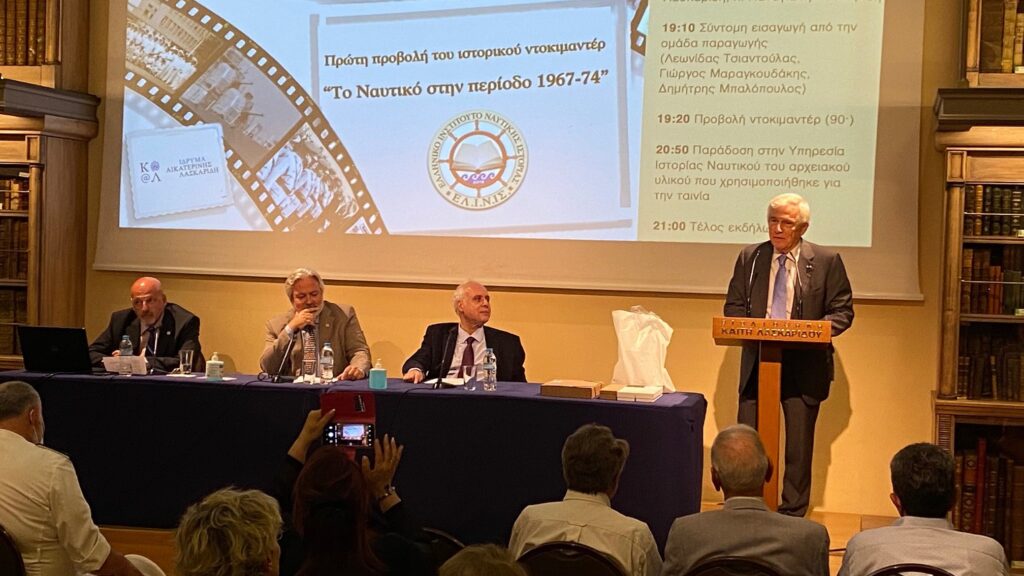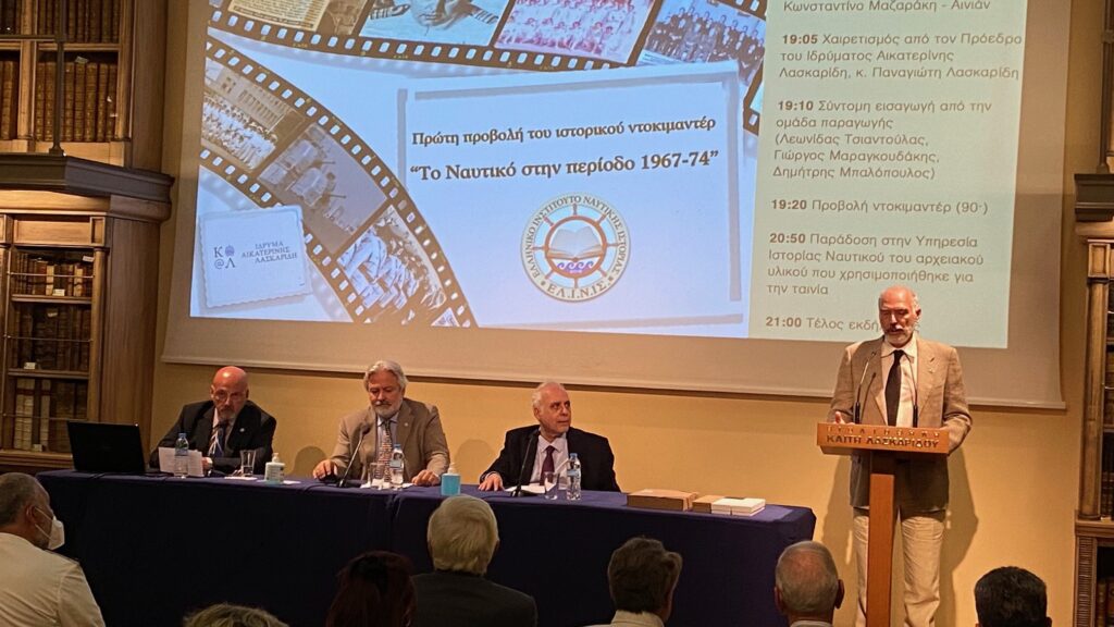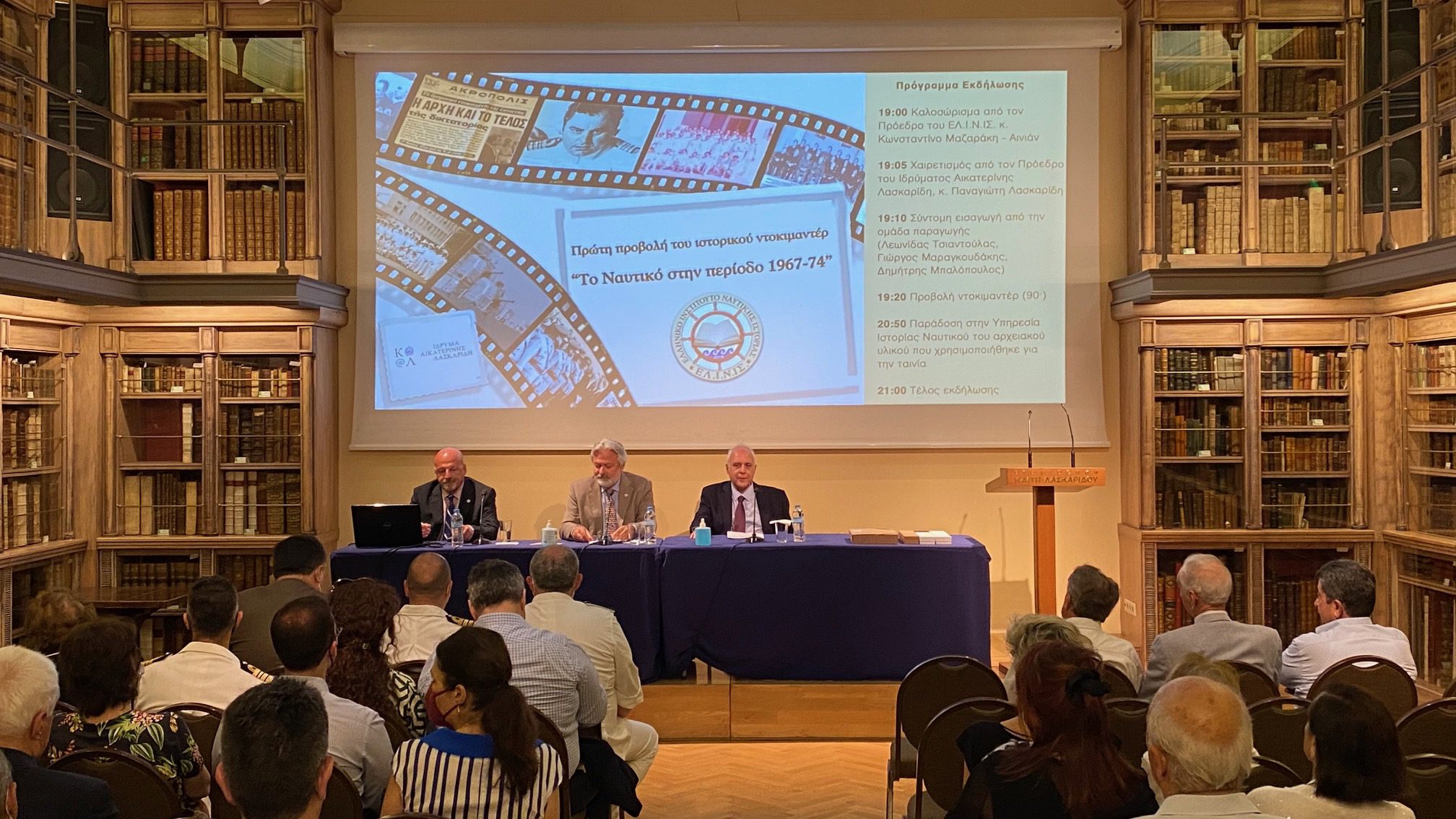Την Δευτέρα 30 Μαίου 2022 πραγματοποιήθηκε στον υπέροχο (και κατάμεστο από κοινό) χώρο της Ιστορικής Βιβλιοθήκης του Ιδρύματος Αικατερίνης Λασκαρίδη η πρώτη δημόσια προβολή του νέου ντοκιμαντέρ του Ελληνικού Ινστιτούτου Ναυτικής Ιστορίας (ΕΛ.Ι.Ν.ΙΣ.), με τίτλο “Το Ναυτικό στην περίοδο 1967-74”. Στην εκδήλωσε απηύθυνε χαιρετισμό ο Πρόεδρος του Ιδρύματος Αικατερίνης Λασκαρίδη κος Πάνος Λασκαρίδης. Το Πολεμικό Ναυτικό εκπροσωπήθηκε από τον Αρχηγό Στόλου Αντιναύαρχο Παναγιώτη Λυμπέρη ΠΝ.
