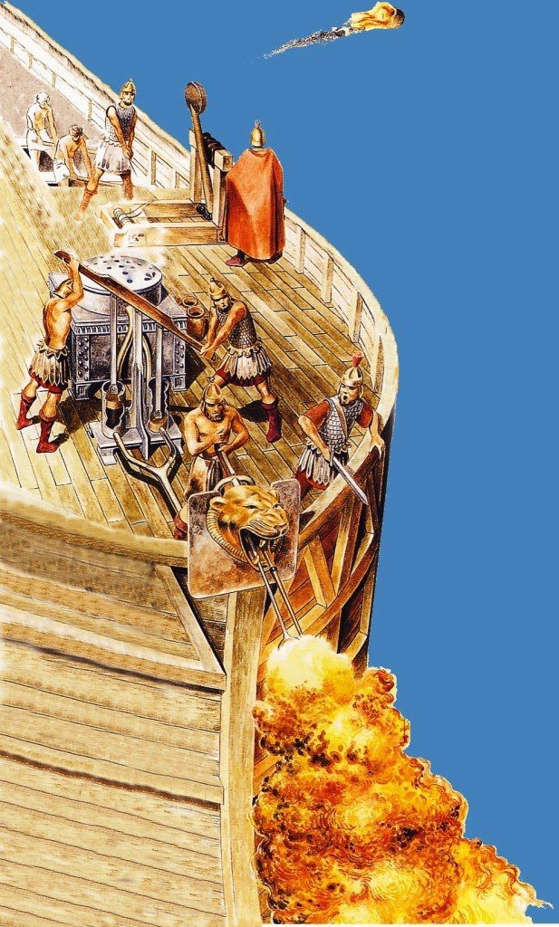 Οι Μεσαιωνικοί πρόγονοι μας κατεναυμάχησαν όλους τους εχθρούς οι οποίοι απετέλεσαν απειλή δια τις εμπορικές θαλάσσιες οδούς της Αυτοκρατορίας, μερικοί εξ αυτών, Άραβες, Τούρκοι, Πειρατές κ.α. Το μυστικό μας όπλον, ήταν το Υγρόν Πυρ, το οποίον εξεσφενδόνιζαν με σίφωνα ή καταπέλτη, ήταν ο καταλυτικός παράγων της νίκης. To Υγρόν Πύρ είχε και άλλες ονομασίες όπως : Ελληνικόν, Ρωμαϊκόν, Μηδικόν, Θαλάσσιον, Σκευαστόν. Εις τα Λατινικά το έλεγαν : Graecus, Liquidus, Humidus, Factitius, Ignis Marinus, Olivum, Incendiarium. Oι Φράγκοι το έλεγαν εις τα Γαλλικά ‘ Feu Grec’ ή‘ Feu Gregois’. Aποδίδεται εις τον Έλληνα Μηχανικό ΚΑΛΛΙΝΙΚΟ (7ος αιών π.Χ.) από την Ηλιούπολιν της Συρίας, το σημερινό Baalbeck.