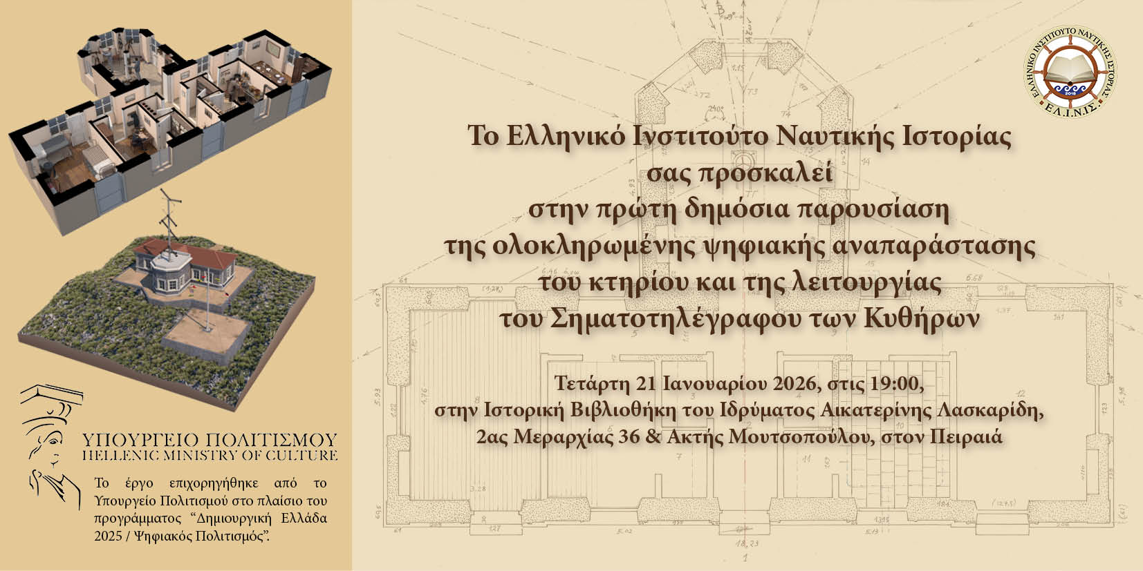 Το Ελληνικό Ινστιτούτο Ναυτικής Ιστορίας, με αφορμή την ολοκλήρωση της ψηφιακής ανασύστασης του ερειπωμένου κτηρίου και της λειτουργίας του Σηματοτηλέγραφου των Κυθήρων, θα παρουσιάσει για πρώτη φορά στο κοινό το αποτέλεσμα του έργου αυτού με τη βοήθεια των συντελεστών του και μέσα από πολύ ενδιαφέρον οπτικό υλικό, την Τετάρτη 21 Ιανουαρίου 2026 στις 7 το απόγευμα στο χώρο της Ιστορικής Βιβλιοθήκης του Ιδρύματος Αικατερίνη Λασκαρίδη (2ας Μεραρχίας & Ακτή Μουτσοπούλου Πειραιάς).