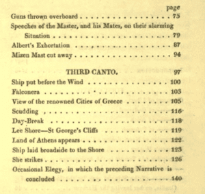 …..προσαρμογή της πορείας και τα ξάρτια, ρίψη του πυροβολικού στη θάλασσα και ακόμη και κόψιμο των καταρτιών. Οι προσπάθειες του πληρώματος είναι τελικά μάταιες και στο Canto ΙΙΙ περιγράφει το ταξίδι του πλοίου στο κεντρικό Αιγαίο, τον πλου κοντά στα γνωστά μας βραχονησίδα Φαλκονέρα, και τον Αι Γιώργη , μέχρι που ναυάγησε κοντά στις βραχώδεις ακτές της Αττικής στο ακρωτήριο Σούνιο, . Η μοίρα του ναυτικού είναι στα χέρια του Ποσειδώνα, και το πλοίο ναυαγεί ακριβώς μπροστά στο ναό του, θυσία μπροστά στο ναό του Ποσειδώνα.