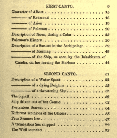 Όπως βλέπουμε στον πίνακα περιεχομένων του ποιήματος, και στο Canto Ι, o Falconer ξεκινά με κάτι ιδιαίτερα πρωτότυπο, την περιγραφή των χαρακτήρων των αξιωματικών του πλοίου.