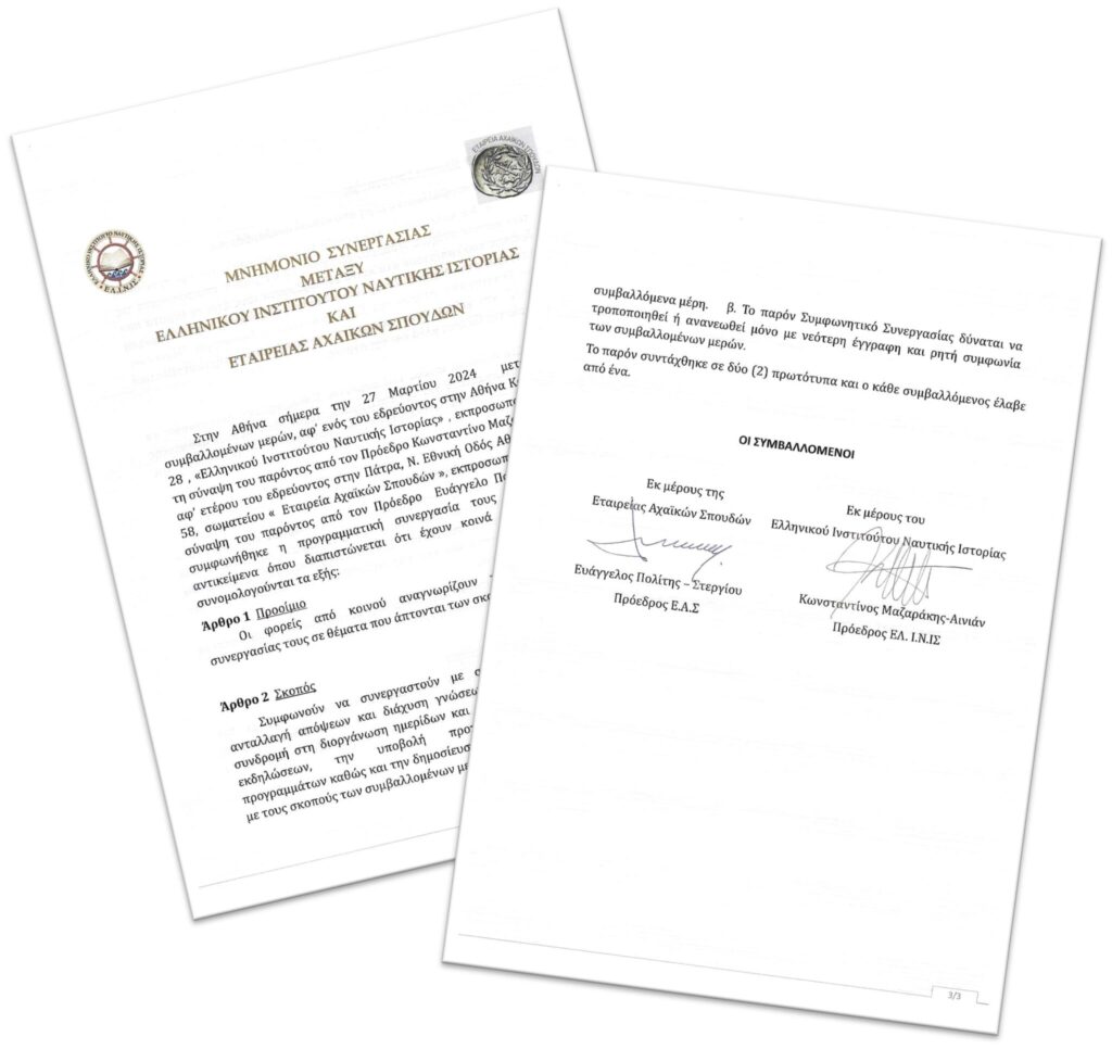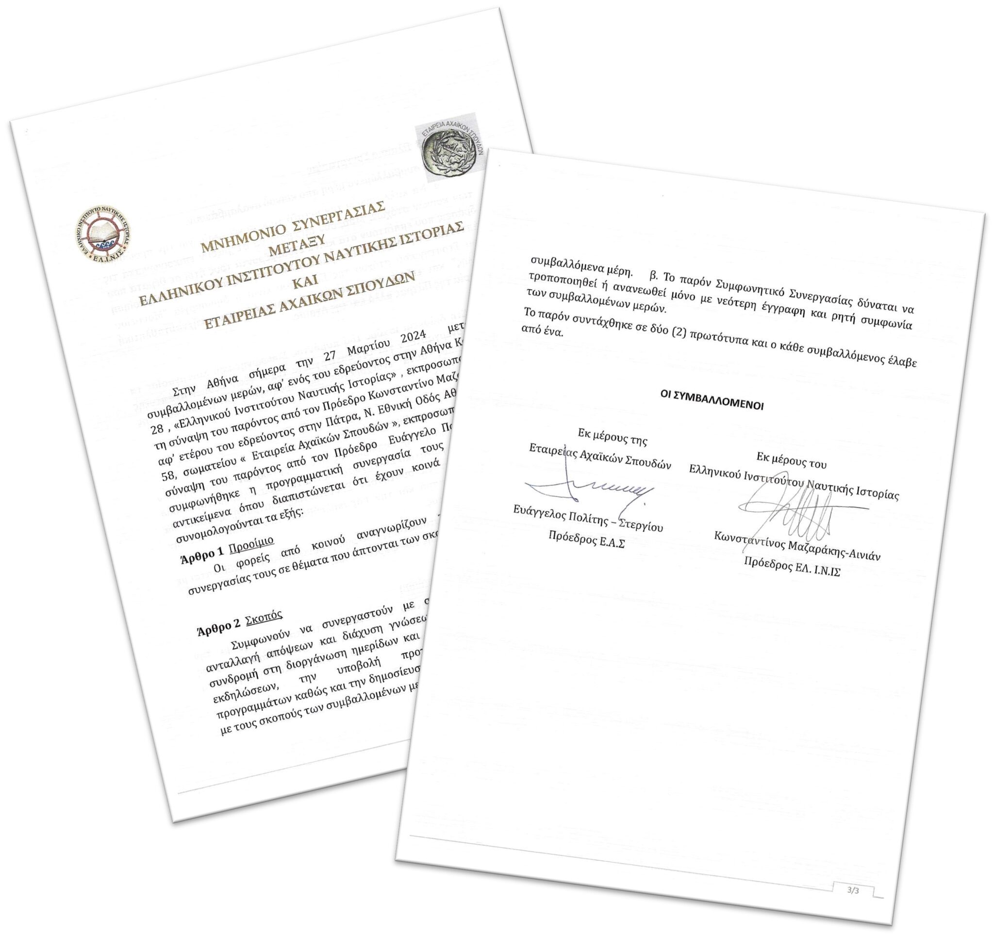 Με την υπογραφή του μνημονίου υπηρετείται με τον καλύτερο τρόπο ένας από τους στόχους του ΕΛ.Ι.Ν.ΙΣ. που είναι η συνεργασία με άλλους φορείς με σκοπό την καλύτερη προβολή και διατήρηση της Ναυτικής Κληρονομιάς και της Ιστορίας του τόπου μας. Η συνεργασία των δύο φορέων θα επικεντρωθεί στην προσπάθεια δημιουργίας Μουσείου της πόλης των Πατρών, που αποτελεί και τον στρατηγικό στόχο της Εταιρείας Αχαϊκών Σπουδών. Το Ελληνικό Ινστιτούτο Ναυτικής Ιστορίας όπου απαιτηθεί θα παρέχει επιστημονική συνδρομή στην ορθή και πλήρη συμπερίληψη της Ναυτικής Ιστορίας και Παράδοσης της περιοχής των Πατρών