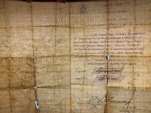 Στην προσπάθειά μας, ως ΕΛ.Ι.Ν.ΙΣ., για τον εντοπισμό και την διάσωση ιστορικών κειμηλίων, συναντούμε κάποιους “μικρούς θησαυρούς” όπως αυτόν που σας παρουσιάζουμε σήμερα. Πρόκειται για ένα άψογα διατηρημένο “Φύλλον Απολύσεως” ναύτη ο οποίος υπηρέτησε στο Θωρηκτό Σπέτσαι την περίοδο 1908-1909. Το έγγραφο είναι χειρόγραφο με ενσφράγιστο χαρτόσημο και σφραγίδα του πλοίου. Το πιο εντυπωσιακό είναι ότι με τον κατάλληλο φωτισμό διακρίνεται ότι είναι γραμμένο επάνω σε ειδικά υδατογραφημένο χαρτί (προφανώς στο πλαίσιο της χαρτοσήμανσης).