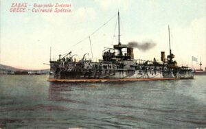 Με την ευκαιρία, δυο λόγια για το Θωρηκτό Σπέτσαι: Ναυπηγήθηκε στο Saint – Nazaire της Γαλλίας μεταξύ των ετών 1887 – 1889, μετά από παραγγελία της Ελληνικής Κυβέρνησης, με σχέδια και μελέτες του Γάλλου ναυάρχου Dupont. Ιδίου τύπου πλοία ήταν τα Θωρηκτά Υδρα και Ψαρά. Κατά τον Ελληνοτουρκικό πόλεμο του 1897 είχε διατεθεί ως πλοίο διοικήσεως μοίρας (μοιραρχίς), στη Δυτική Μοίρα του Ιονίου, που τελούσε υπό τη διοίκηση του Δ. Κριεζή, με κυβερνήτη τον πλοίαρχο Γ. Αποστόλη. Κατά την εκεί παραμονή του μετά το συμβάν της βύθισης του επίτακτου ΜΑΚΕΔΟΝΙΑ πραγματοποίησε βομβαρδισμό των τουρκικών φρουρίων στην είσοδο του Αμβρακικού χωρίς όμως την αναμενόμενη πλήρη επιτυχία. Στον Α΄ Βαλκανικό πόλεμο αποτελούσε επίσης πλοίο διοικήσεως μοίρας (μοιραρχίς), υπό τον πλοίαρχο Π. Γκίνη με κυβερνήτη τον Αντ/ρχο Α. Βουρέκα. Κατά την περίοδο 1922 – 1929 χρησιμοποιήθηκε ως Σχολή Συνεννοήσεως. Στη συνέχεια διαλύθηκε.