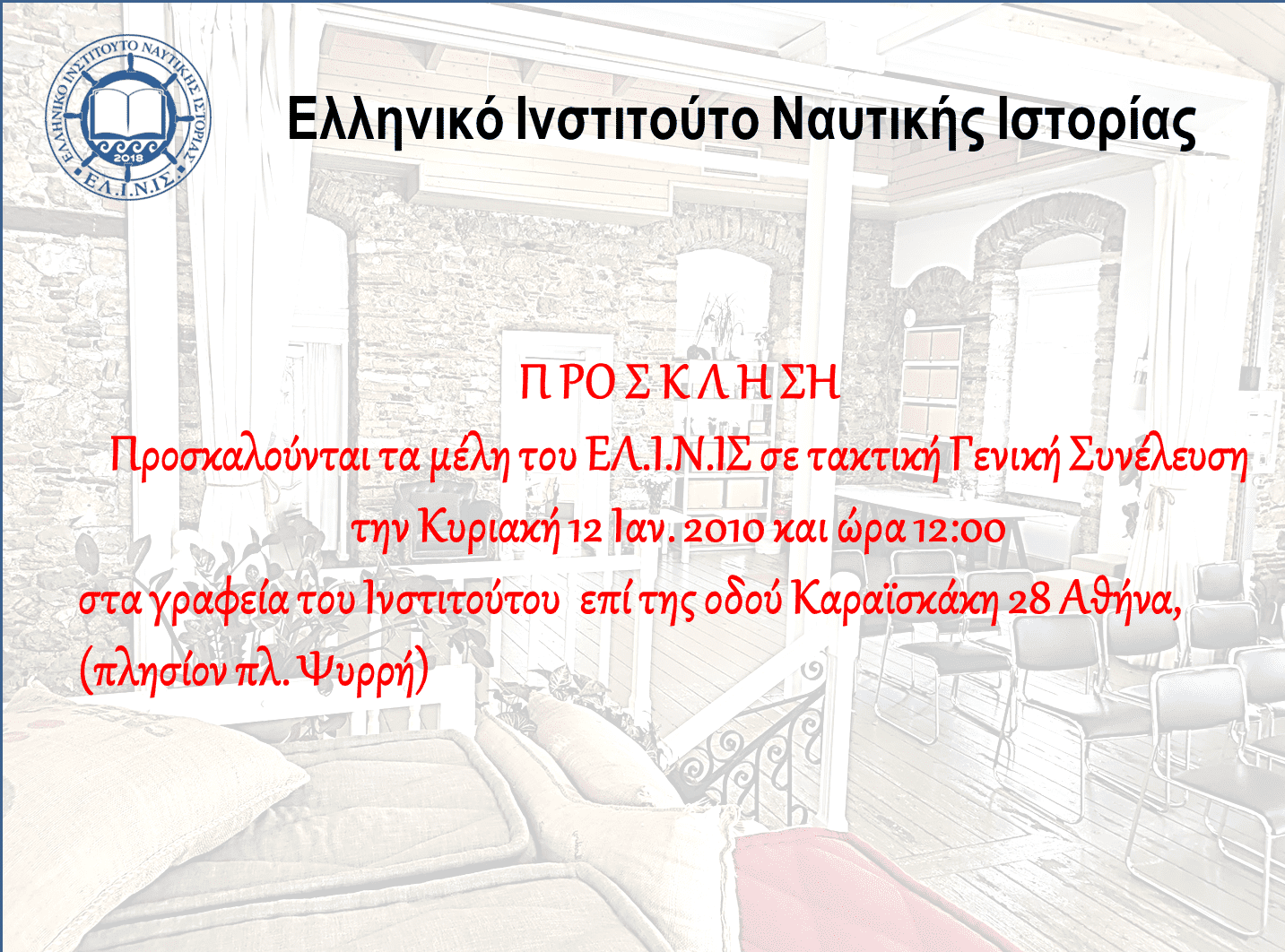 Το Διοικητικό Συμβούλιο του ΕΛ.Ι.Ν.ΙΣ προσκαλεί τα μέλη του σε Τακτική Γενική Συνέλευση και σύμφωνα με το άρθρο 11 του Καταστατικού την 12 Ιανουαρίου 2020, ημέρα Κυριακή και ώρα 12:00 στα γραφεία-έδρα...