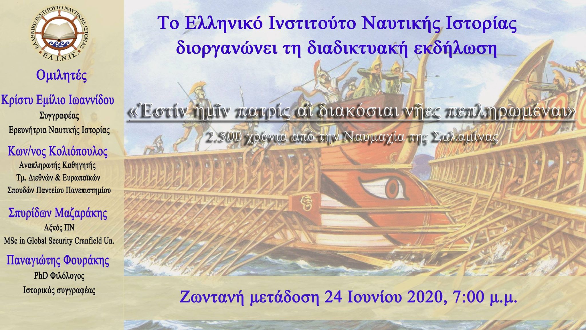 [vc_row][vc_column][vc_column_text] Το Ελληνικό Ινστιτούτο Ναυτικής Ιστορίας (ΕΛ.Ι.Ν.ΙΣ.), με την ευκαιρία της συμπλήρωσης 2.500 ετών από την Ναυμαχία της Σαλαμίνας, σας προσκαλεί στην διαδικτυακή εκδήλωση: «Ἐστίν ἡμῖν πατρίς αἳ διακόσιαι νῆες...
