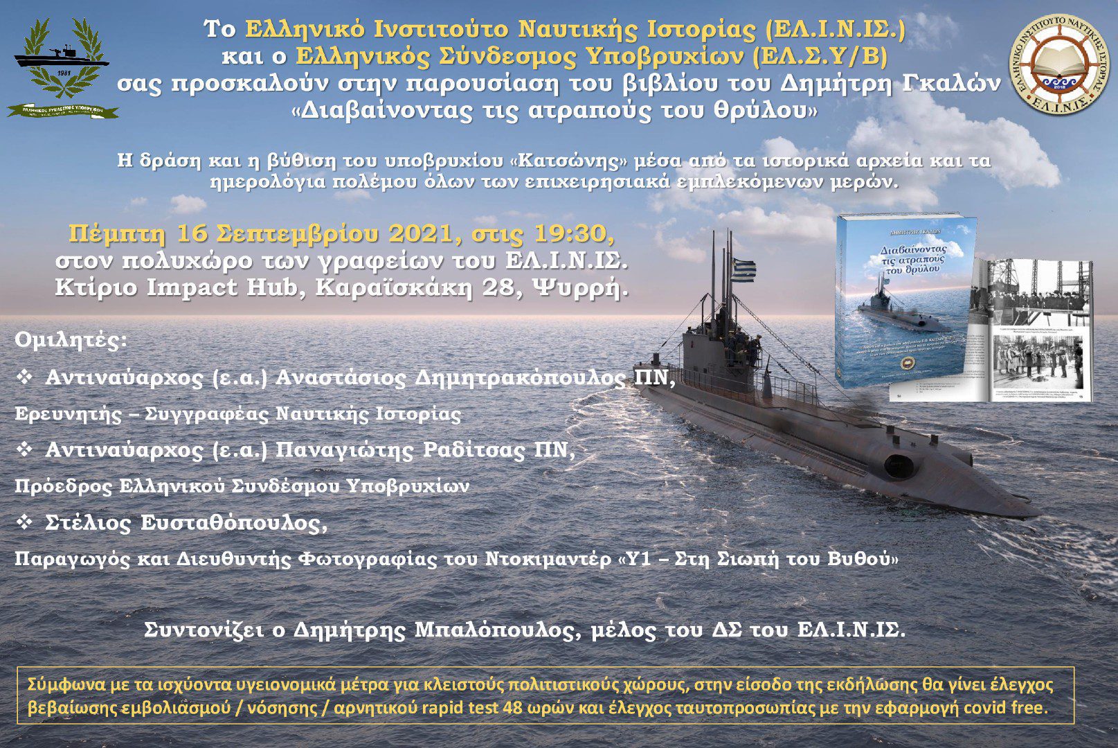 Το Ελληνικό Ινστιτούτο Ναυτικής Ιστορίας (ΕΛ.Ι.Ν.ΙΣ) και ο Ελληνικός Σύνδεσμος Υποβρυχίων (ΕΛ.Σ.Υ/Β), στο πλαίσιο της συμπλήρωσης 78 ετών από την βύθιση του υποβρυχίου “ΚΑΤΣΩΝΗΣ”, σας προσκαλούν στην παρουσίαση του βιβλίου...