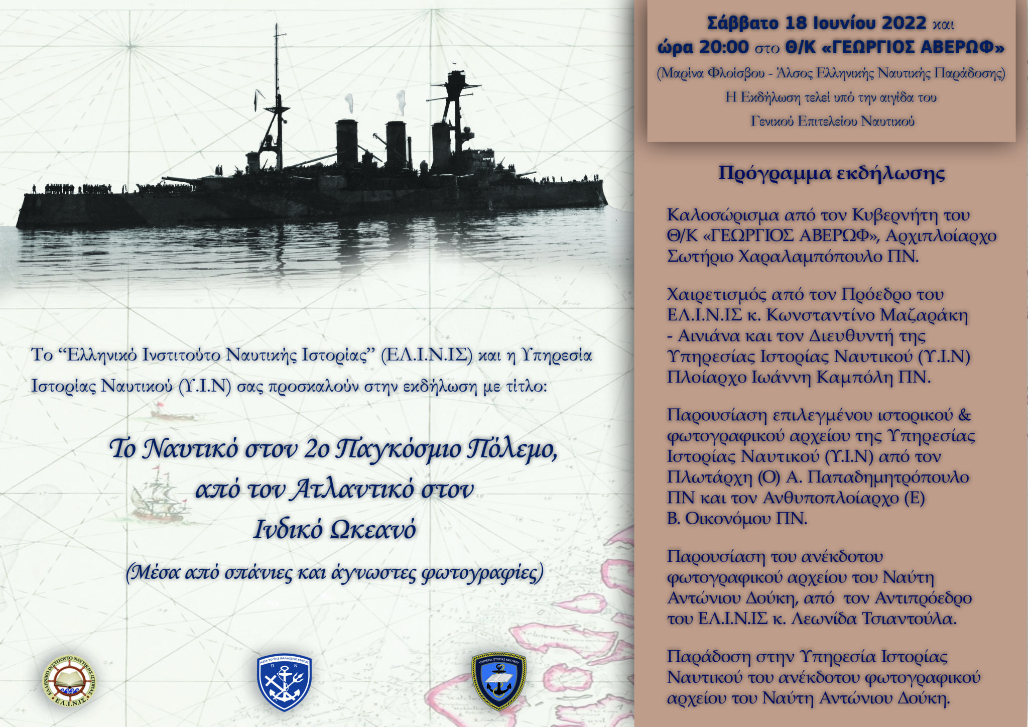 Το Σάββατο 18 Ιουνίου πραγματοποιήθηκε στο Θωρηκτό Αβέρωφ εκδήλωση που συνδιοργάνωσαν το Ελληνικό Ινστιτούτο Ναυτικής Ιστορίας και η Υπηρεσία Ιστορίας Ναυτικού με θέμα "Το Ναυτικό στον Β' Παγκόσμιο Πόλεμο, από...