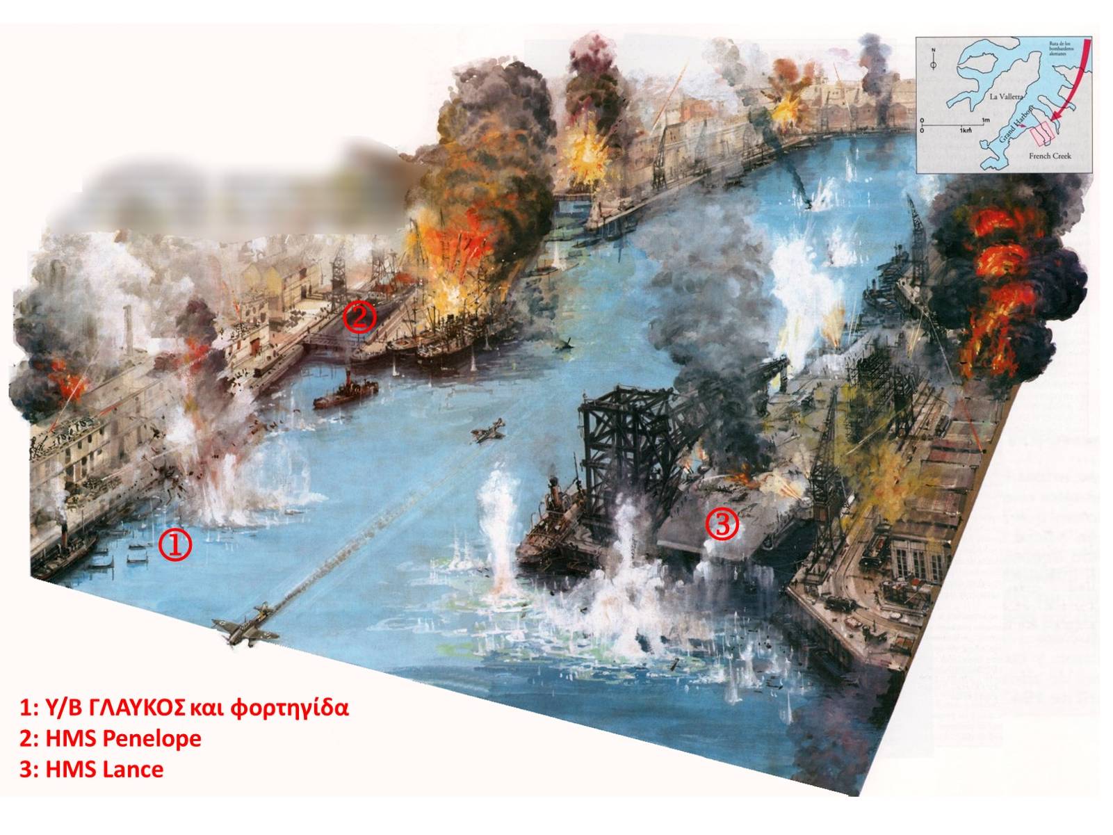 - (11:27’;;;) Ο Γλαύκος και η πετρελαιοφορτηγίδα δέχονται τρεις βόμβες και βυθίζονται εντός δύο λεπτών φράζοντας σε μεγάλο βαθμό το εσωτερικού του όρμου French Creek.