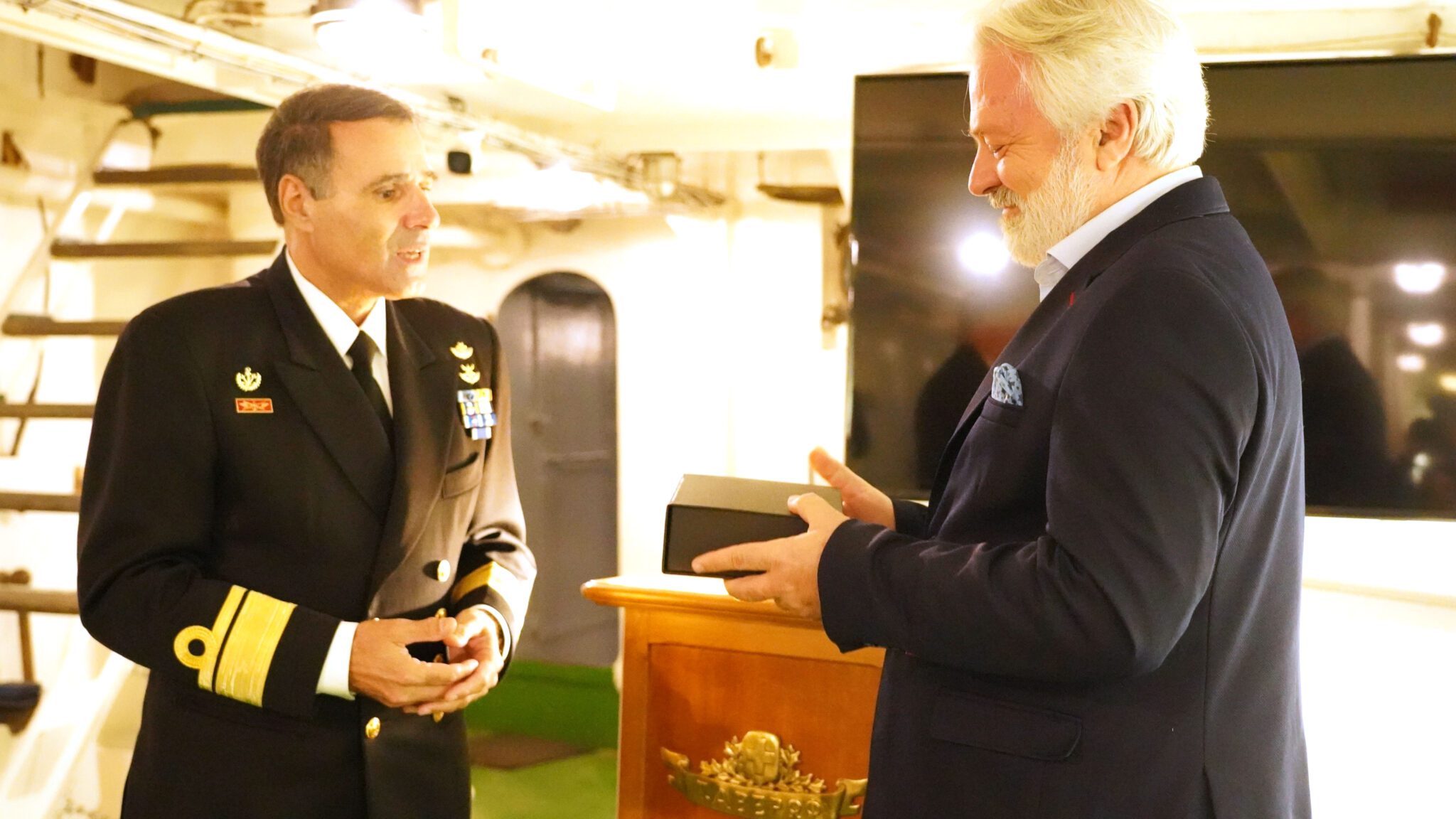 Η χορηγία της έκθεσης έγινε εφικτή χάρη στην ευγενή συνεισφορά 2 εκλεκτών μελών του ΕΛ.Ι.Ν.ΙΣ. Του κ. Ανδρέα Δημητριάδη (στη μνήμη του αειμνήστου πατρός του Αντιναυάρχου Κωστή Δημητριάδη, ο οποίος υπήρξε ιδρυτικό μέλος του Ινστιτούτου) και του Αντιπλοιάρχου (ΛΣ) Παναγιώτη Μαριδάκη, Ναυτιλιακού Ακόλουθου στο Σάντος της Βραζιλίας (προς τιμήν του συγγενή του Πλωτάρχη Γεώργιου Μαριδάκη, ο οποίος υπηρετών στο Υ/Β ΠΡΩΤΕΥΣ, ως Ύπαρχος, απωλέσθη κατά τη βύθιση του Υ/Β την 29 Δεκεμβρίου 1940 στην Αδριατική). Ο Κυβερνήτης του πλοίου Υποναύαρχος Ι. Καλογερόπουλος ΠΝ προσέφερε αναμνηστικά δώρα στον Πρόεδρο και στον Αντιπρόεδρο του ΕΛ.Ι.Ν.ΙΣ. καθώς και στους δωρητές (τον Αντιπλοίαρχο (ΛΣ) Π.Μαριδάκη, λόγω απουσίας του στο εξωτερικό, εκπροσώπησε η συγγενής του κα Κρίστυ Εμίλιο Ιωαννίδου, μέλος του ΔΣ του ΕΛ.Ι.Ν.ΙΣ.)