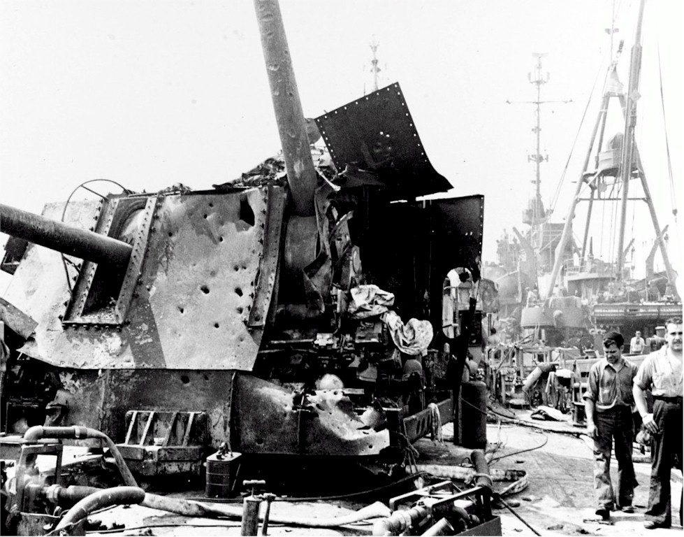 Πράγματι οι άνδρες του Νο.2 πύργου έστρεψαν προς τη απειλή και με μια ομοβροντία των δίδυμων πυροβόλων, τίναξαν στον αέρα το “Val”, το οποίο δέχθηκε απευθείας πλήγμα, από βλήμα των 5 ιντσών. Η ύπαρξη των Αμερικανικών καταδιωκτικών έσωσε το πληγωμένο πλοίο από τα χειρότερα. Οι επιθέσεις σταμάτησαν και το πλήρωμα μπόρεσε να σβήσει τις φωτιές και να σταματήσει την εισροή υδάτων. Δύο ρυμουλκά που έδεσαν στα πλαϊνά του σκάφους βοήθησαν στην απάντληση των υδάτων, καθώς το ύψος εξάλων του πλοίου, είχε μειωθεί στο ελάχιστο και τα κύματα είχαν αρχίσει να ανεβαίνουν στο κατάστρωμα. Ο Πλωτάρχης Frederick J Becton αρνήθηκε να διατάξει εγκατάλειψη του σκάφους και τελικά το USS Laffey (DD-724) κατάφερε να φτάσει σε μία προωθημένη αμερικανική βάση για επισκευές και αργότερα να επιστρέψει στο Pearl Harbor. Η μάχη κράτησε για 80 εφιαλτικά λεπτά καθώς 22 αεροσκάφη επιτέθηκαν στο πλοίο προσπαθώντας να το βυθίσουν. Επί του αντιτορπιλικού συνετρίβησαν πέντε καμικάζι, ενώ χτυπήθηκε από τέσσερεις βόμβες και αρκετά κοντινά πλήγματα (near misses). Πρέπει να σημειωθεί ότι ο αριθμός των πληγμάτων διαφέρει, ανάλογα την πηγή, από 4 έως 6 καμικάζι. Οι πυροβολητές του αντιτορπιλικού χρεώθηκαν με την κατάρριψη 9 αεροσκαφών. Οι απώλειες μεταξύ του πληρώματος των 336 ανδρών, ανήλθαν σε 32 νεκρούς και 71 τραυματίες.