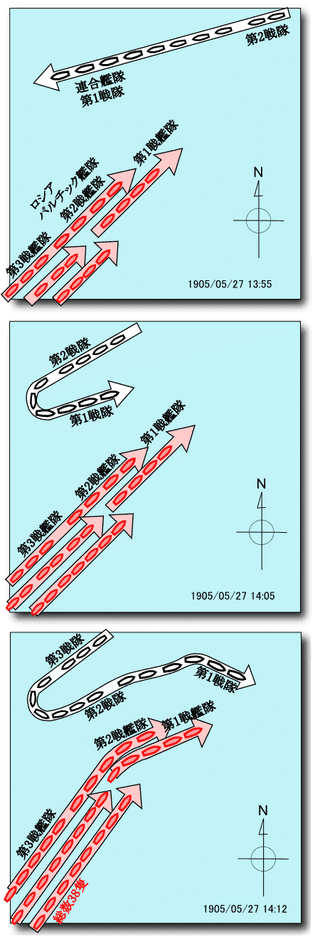 Η ναυμαχία ξεκίνησε αρκετά αργότερα, όταν το μεσημέρι περί τις 2:45 ο Τόγκο επιτέθηκε, εφαρμόζοντας την περίφημη τακτική «‘Τ’ του Νέλσονα», δηλαδή όταν πέρασε με όλα τα πλοία του κάθετα από το σχηματισμό μάχης των Ρώσων, αποκτώντας το πλεονέκτημα να μπορεί να βάλλει εναντίον τους με δυο πυροβόλα και να δέχεται πυρά μόνο από τα πρωραία ρωσικά πυροβόλα. Κατά την κίνηση, το πρώτο πλοίο που κτυπήθηκε ήταν η ιαπωνική ναυαρχίδα, το θωρηκτό «Μικάσα», το οποίο όμως δεν έπαθε σοβαρή βλάβη. Οι Ιάπωνες εκτός από καλύτεροι πυροβολητές χρησιμοποιούσαν και εκρηκτικά βλήματα, σε αντίθεση με τους Ρώσους που χρησιμοποιούσαν κρουστικά. Μετά τη βύθιση του πρώτου ρωσικού θωρηκτού, «Μποροντίνο», κτυπήθηκε και η ρωσική ναυαρχίδα «Πρίγκιπας Σουβόρωφ» και ο ναύαρχος Ραζεστβένσκυ ετέθη εκτός μάχης, με το ναύαρχο Νεμπογκατώφ να τον αντικαθιστά. Πριν νυχτώσει οι Ιάπωνες με απόλυτη επιτυχία βύθισαν τα θωρηκτά «Οσλυάμπυα», «Αυτοκράτωρ Αλέξανδρος Γ΄» και το «Πρίγκιπας Σουβόρωφ».