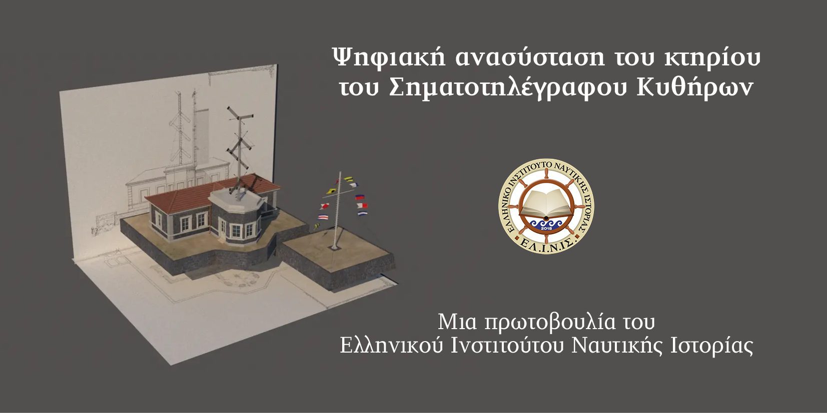 Το Ελληνικό Ινστιτούτο Ναυτικής Ιστορίας, με αφορμή την ολοκλήρωση της ψηφιακής ανασύστασης του ερειπωμένου κτηρίου του Σηματοτηλέγραφου των Κυθήρων, θα παρουσιάσει για πρώτη φορά στο κοινό το αποτέλεσμα του έργου αυτού με τη βοήθεια των συντελεστών του και μέσα από πολύ ενδιαφέρον οπτικό υλικό, την Τετάρτη 18 Σεπτεμβρίου 2024 στις 7 το απόγευμα στο χώρο της Ιστορικής Βιβλιοθήκης του Ιδρύματος Αικατερίνη Λασκαρίδη (2ας Μεραρχίας & Ακτή Μουτσοπούλου Πειραιάς).